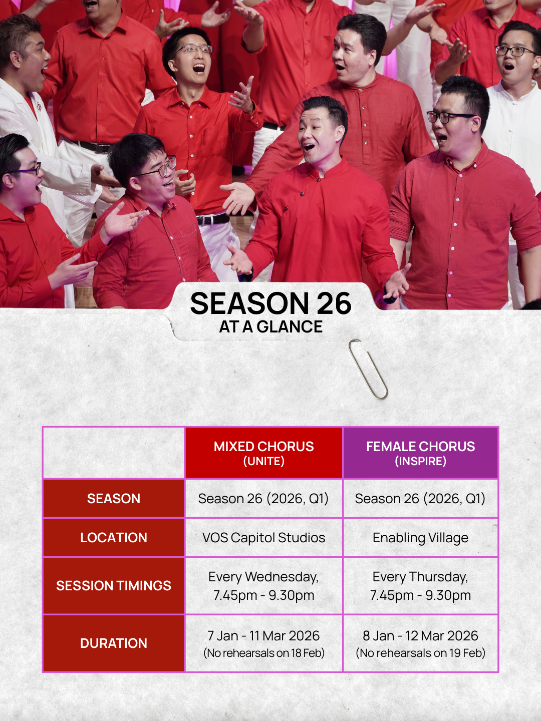 Led by Artistic Director Dr. Darius Lim and a passionate team of artistic coordinators and conductors, the choir runs 4 fun-filled seasons each year with weekly sessions over 8–10 weeks.