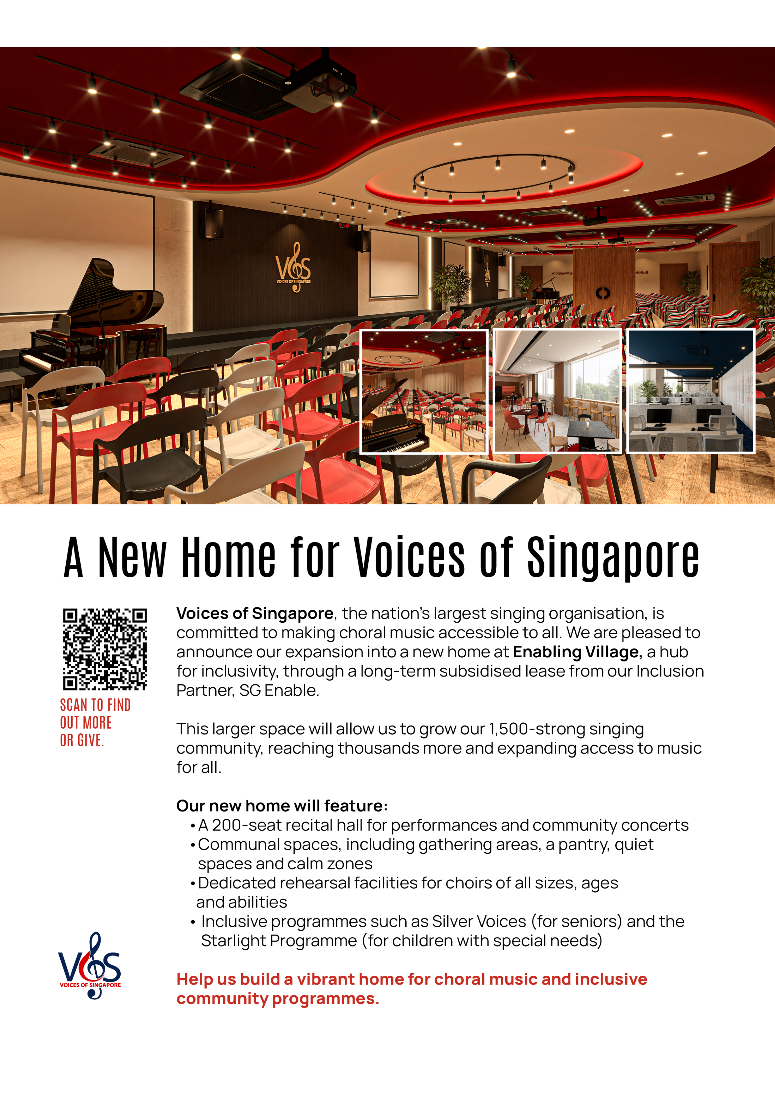 Voices of Singapore is building the VOS Choral Hub at Enabling Village – a space where children will take their first musical steps, where seniors stay connected through song, and where individuals of all abilities can come together in harmony. It will be a place where every voice is welcome, heard and celebrated.